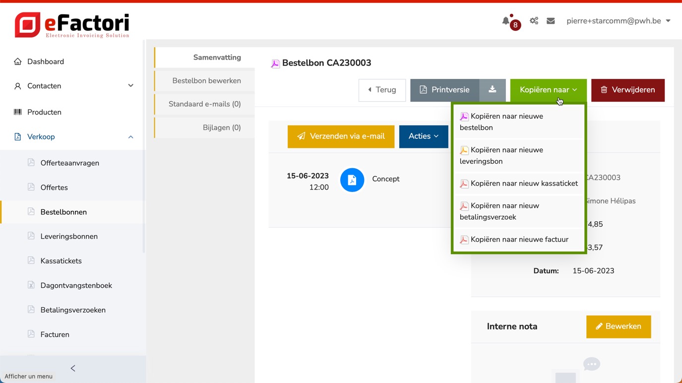Ga in de samenvatting van je bestelbon naar de groene knop 'Kopiëren naar' en kies daar uit de vermelde acties.&#x20;