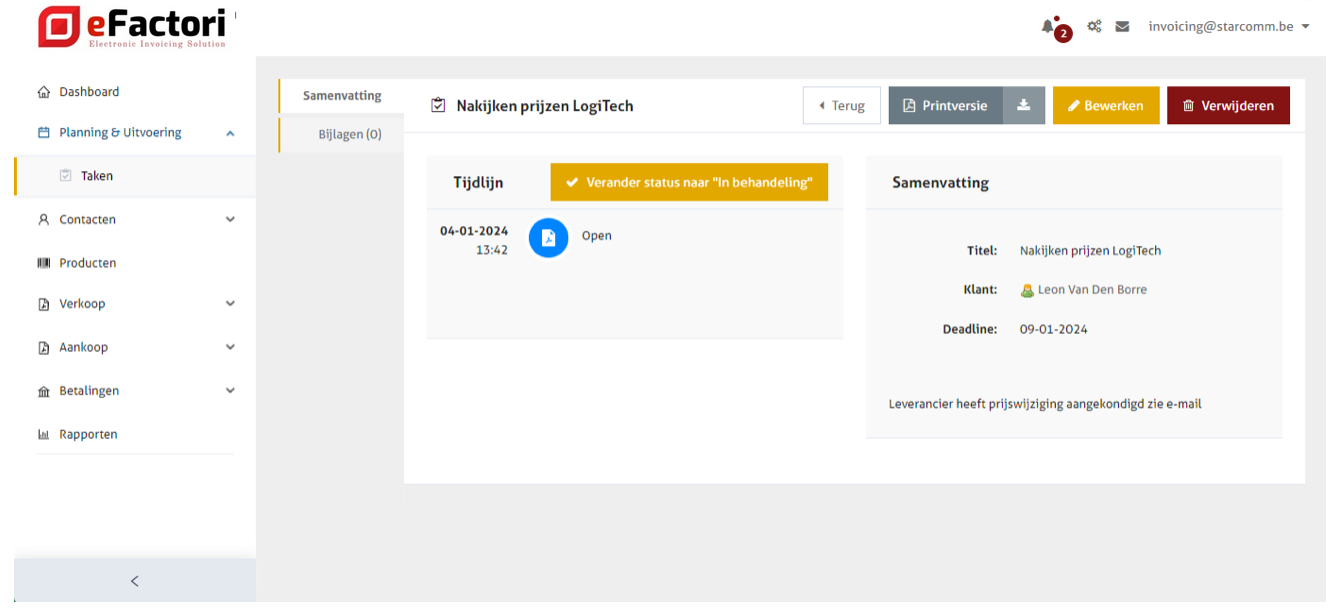 Hier zie je de status van de taak: als een taak is aangemaakt, krijgt ze de status 'Open'. Zodra je met de taak bezig bent kan je deze wijzigen naar 'In behandeling'. Na afwerking kan je de taak wijzigen naar status 'Voltooid'.