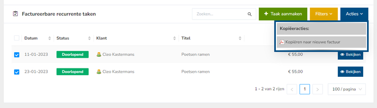 Deze recurrente taken kan je dan bundelen in één, bv. maandelijkse factuur. Zo vermijd je dat bv. wekelijkse of tweewekelijkse taken telkens een individuele factuur krijgen (minder administratie).