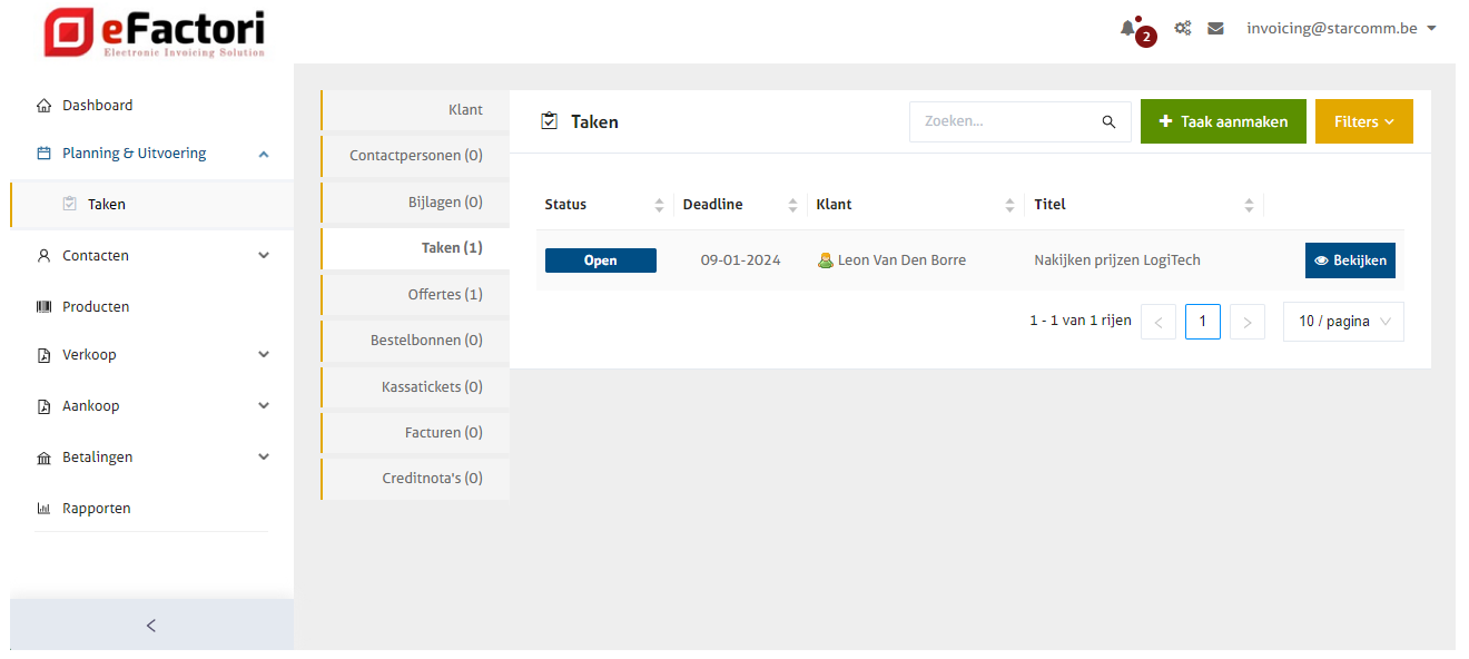De taak wordt automatisch gekoppeld aan de klant aan wie de offerte gericht werd. In het overzicht van de taak staat ook een link naar de offerte, zodat deze makkelijk terug opgeroepen kan worden.