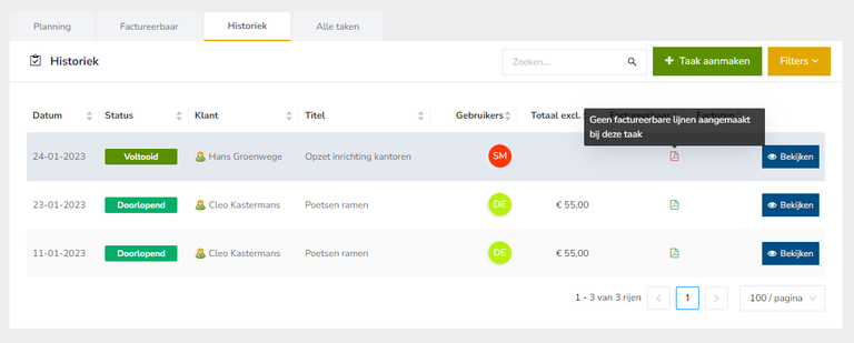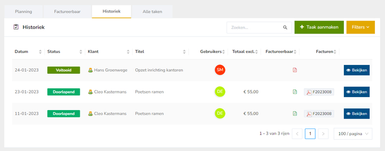 In de tab 'Historiek' zie je een overzicht van alle taken die in het verleden liggen.