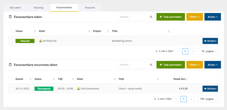 Onder de tab 'Alle taken' krijg je een overzicht van alle taken, ongeacht of ze een datum kregen (ingepland zijn/waren) of niet. Dankzij de kolom 'Factureerbaar' kan je ook hier nogmaals opvolgen welke taken je reeds gefactureerd hebt.